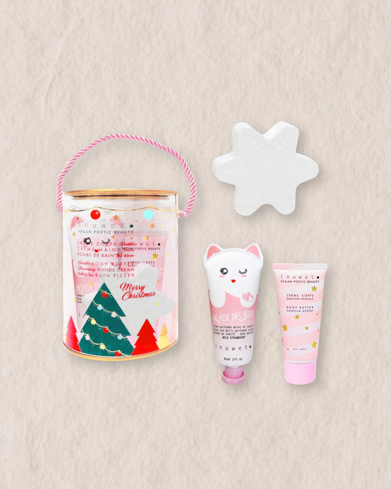 Set de regalo que contiene una figura efervescente para el baño en forma de copito de nieve de 55 gramos y aroma de té blanco, crema de manos con aroma a fresas del bosque y crema corporal de 60ml.